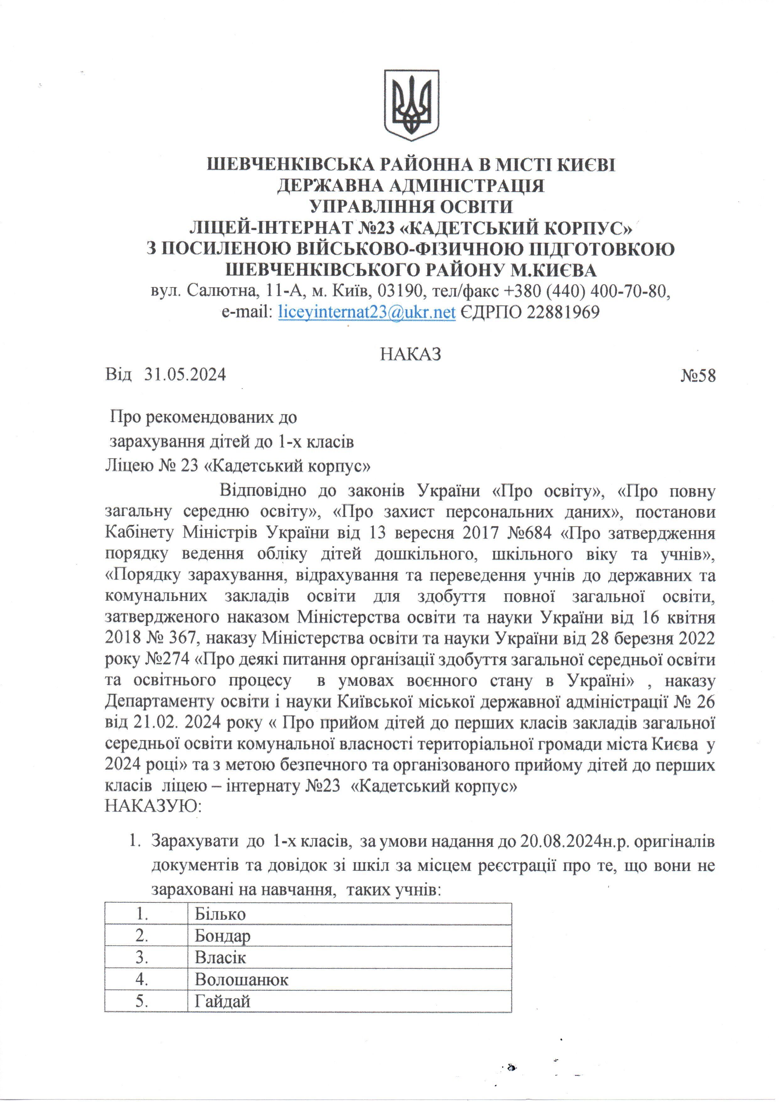 Відповідно до законів України «Про освіту», «Про повну загальну середню освіту», «Про захист персональних даних», постанови Кабінету Міністрів України від 13 вересня 2017 №684 «Про затвердження порядку ведення обліку дітей дошкільного, шкільного віку та учнів», «Порядку зарахування, відрахування та переведення учнів до державних та комунальних закладів освіти для здобуття повної загальної освіти, затвердженого наказом Міністерства освіти та науки України від 16 квітня 2018 № 367, наказу Міністерства освіти та науки України від 28 березня 2022 року №274 «Про деякі питання організації здобуття загальної середньої освіти та освітнього процесу в умовах воєнного стану в Україні» , наказу Департаменту освіти і науки Київської міської державної адміністрації № 26 від 21.02. 2024 року « Про прийом дітей до перших класів закладів загальної середньої освіти комунальної власності територіальної громади міста Києва у 2024 році» та з метою безпечного та організованого прийому дітей до перших класів ліцею – інтернату №23 «Кадетський корпус»
